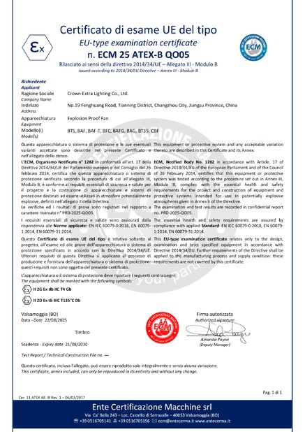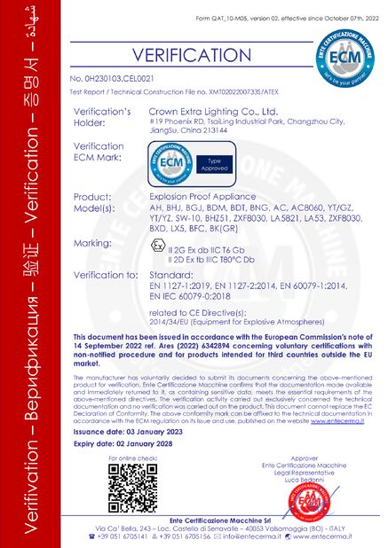 Tiêu chuẩn:ATEX Số:ECM 24 ATEX-D QS01 ngày phát hành:2024-08-06 Ngày hết hạn:2027-08-05 |